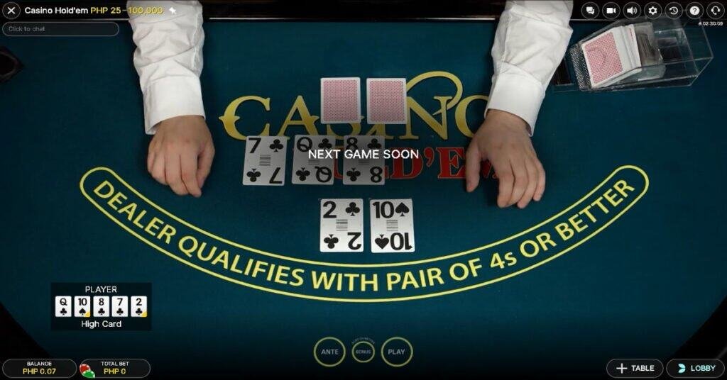 Evolution Gaming offers several different poker tables, including Casino Hold’em, 2 Hand Casino Hold’em, Texas Hold’em, Extreme Texas Hold’em, and Caribbean Stud Poker. Some of these games feature some rule variations that affect the mechanics but the core gameplay stays the same and the poker hands retain their standard rankings.